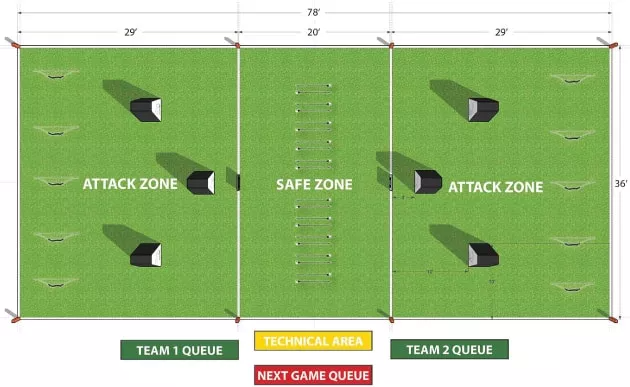 Every squad is divided by a “safe zone,” and they may hide behind inflatable barriers on either side.